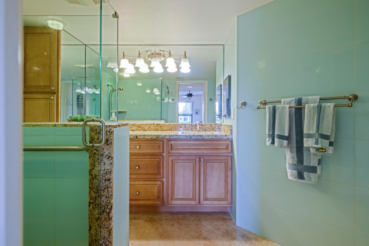 This updated two-bedroom, two-bathroom condo in Montego Cove, a 55-plus community, features a spacious courtyard patio and an enclosed porch with lake views. Inside, you'll find newer LVT flooring, an updated kitchen with granite countertops, and a generous living and dining area. The primary suite has walk-in closets, and there's storm protection with accordion hurricane shutters. Community amenities include two swimming pools, tennis and pickleball courts, and a clubhouse for social activities. Conveniently located near downtown Stuart, US-1 shopping, local beaches, and medical facilities.
