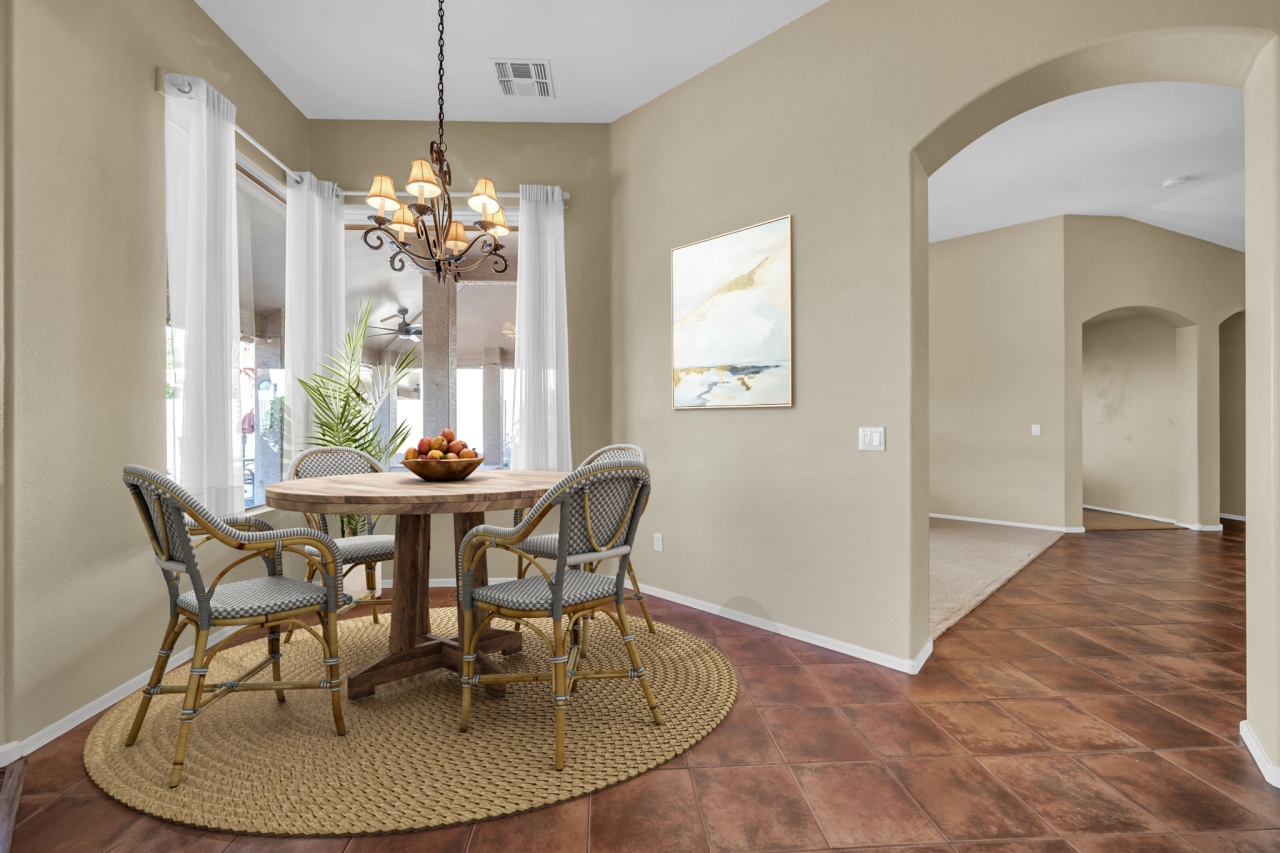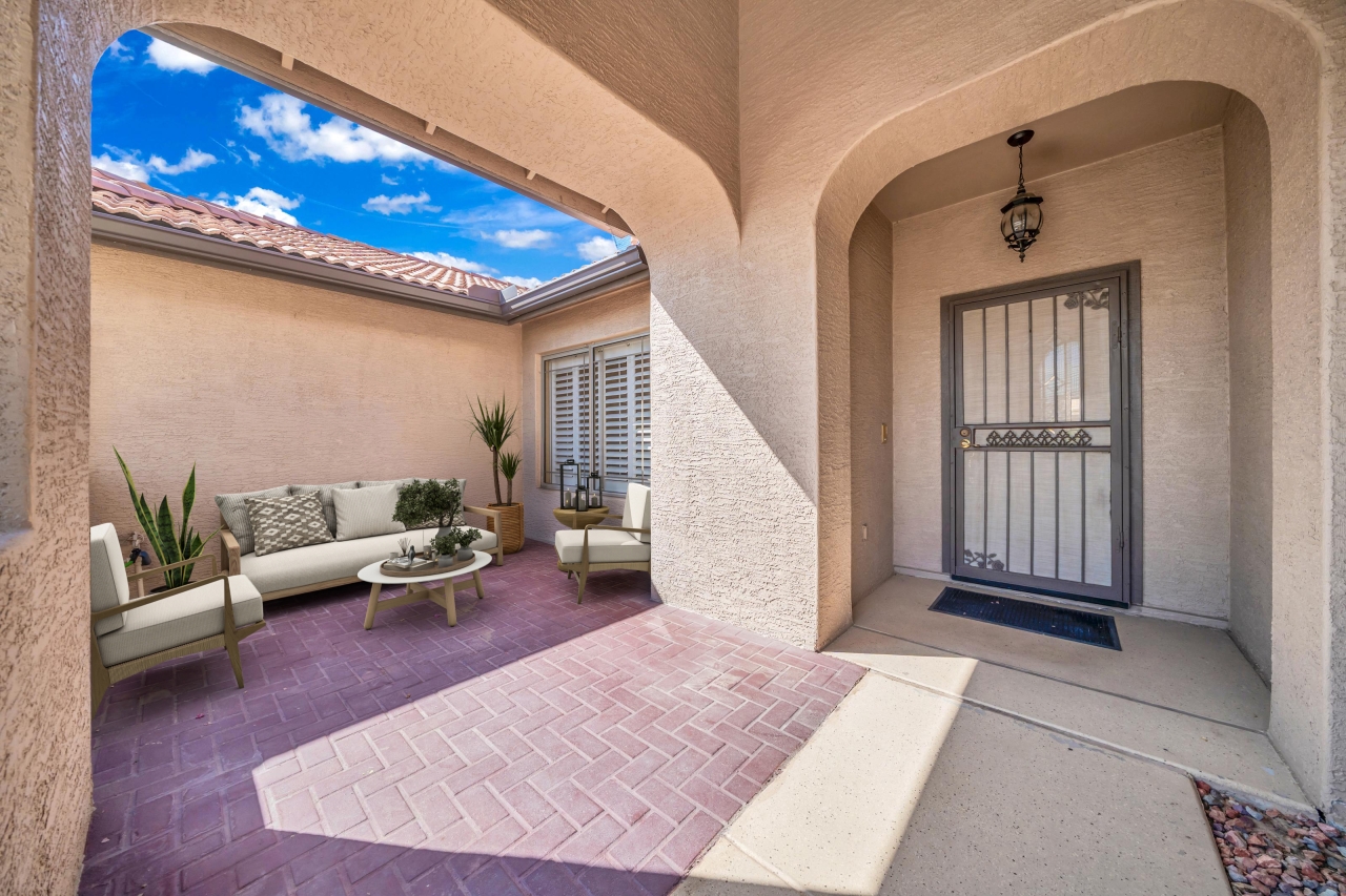 Welcome to your new home in the desirable active adult golf community of PebbleCreek. Spacious Milano model located on a premium large corner lot with walled in back yard for your privacy. As you're greeted through the pavered front courtyard, the home features 2 bed, 2 bath + Den, 1,989 sq ft, with neutral color palette, high ceilings, tile and LVP flooring in all the right places and plantation shutters throughout. Enjoy the stone clad fireplace just off the great room, that flows effortlessly into the eat-in kitchen equipped with large peninsula breakfast bar, granite countertops, new white cabinets and SS appliances. The split bedroom floor plan includes a versatile den/retreat with custom built-in cabinets and desk. Your out-of-town guests will love the private guest room and bath. The primary suite offers a step-in shower, double sinks, spacious dual closets and separate linen closet. The dining and living room areas can be used in a variety of ways. Sliding glass doors off the great room leads to your backyard oasis to enjoy the Arizona sunsets complete with expanded covered patio for relaxing and hearing the soothing sound of the rock waterfall with mature landscape including fruit trees and new epoxy patio floor. Live the resort lifestyle with access to all the amenities, including clubhouse, spa, fitness center, three golf courses, multiple pools, numerous sport courts (pickle ball, tennis, bocce) multiple dining options. Other features include dog parks, walking/biking trails and wide-open spaces. Easy access to freeways, shopping and dining. Don't miss out on this gem!