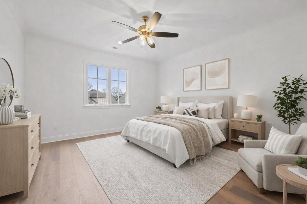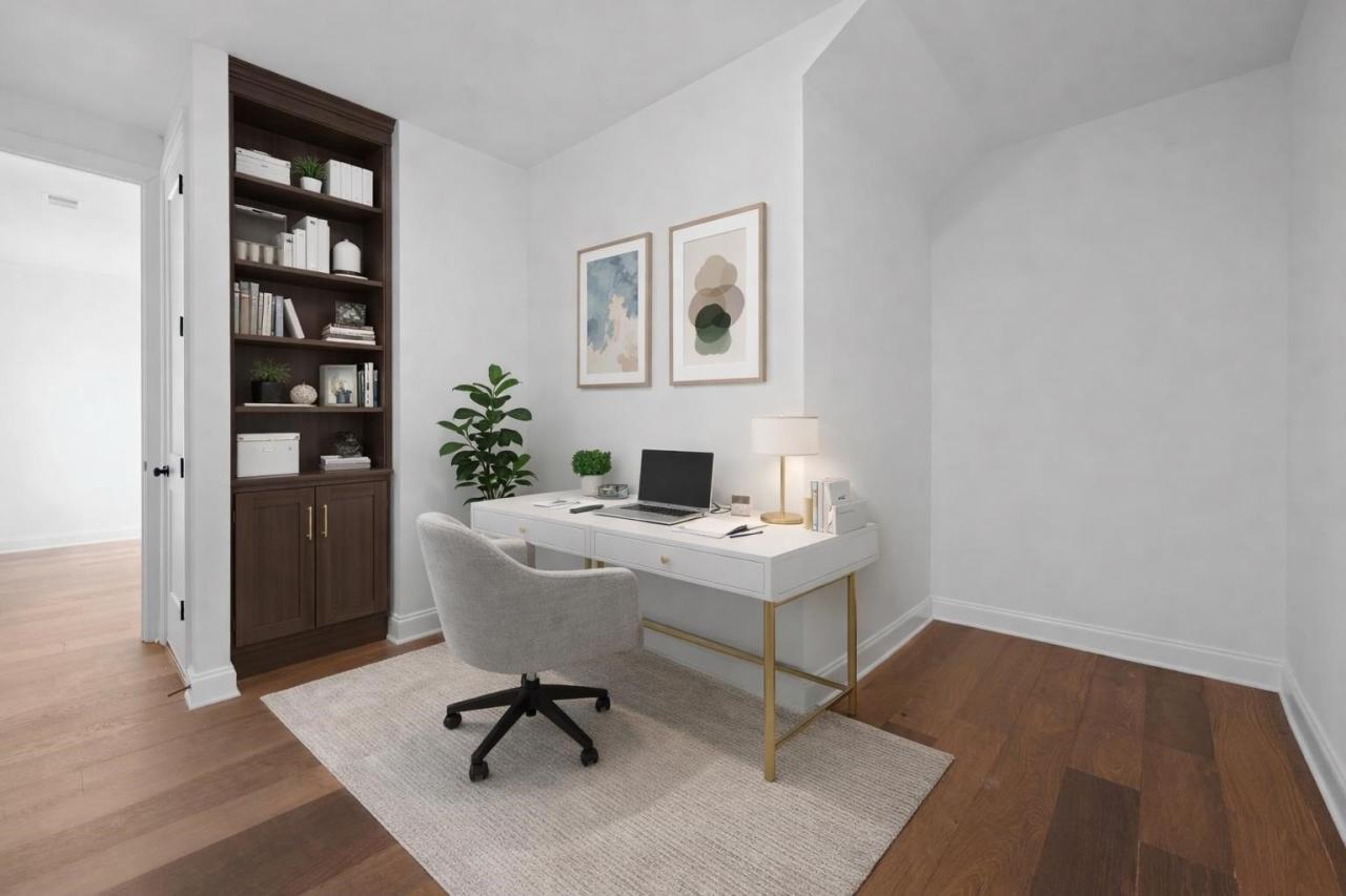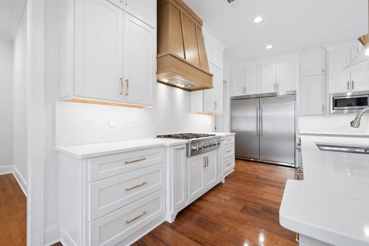 The chef’s kitchen is a statement in both function and elegance, appointed with GE Café Professional Series appliances, stacked smart double convection ovens, a 36-inch commercial gas rangetop, dual dishwashers, built-in refrigerator and freezer, custom cabinetry, and quartz surfaces. Engineered hardwood flooring extends throughout both levels, complemented by soaring 10-foot ceilings, detailed crown molding, and designer finishes.