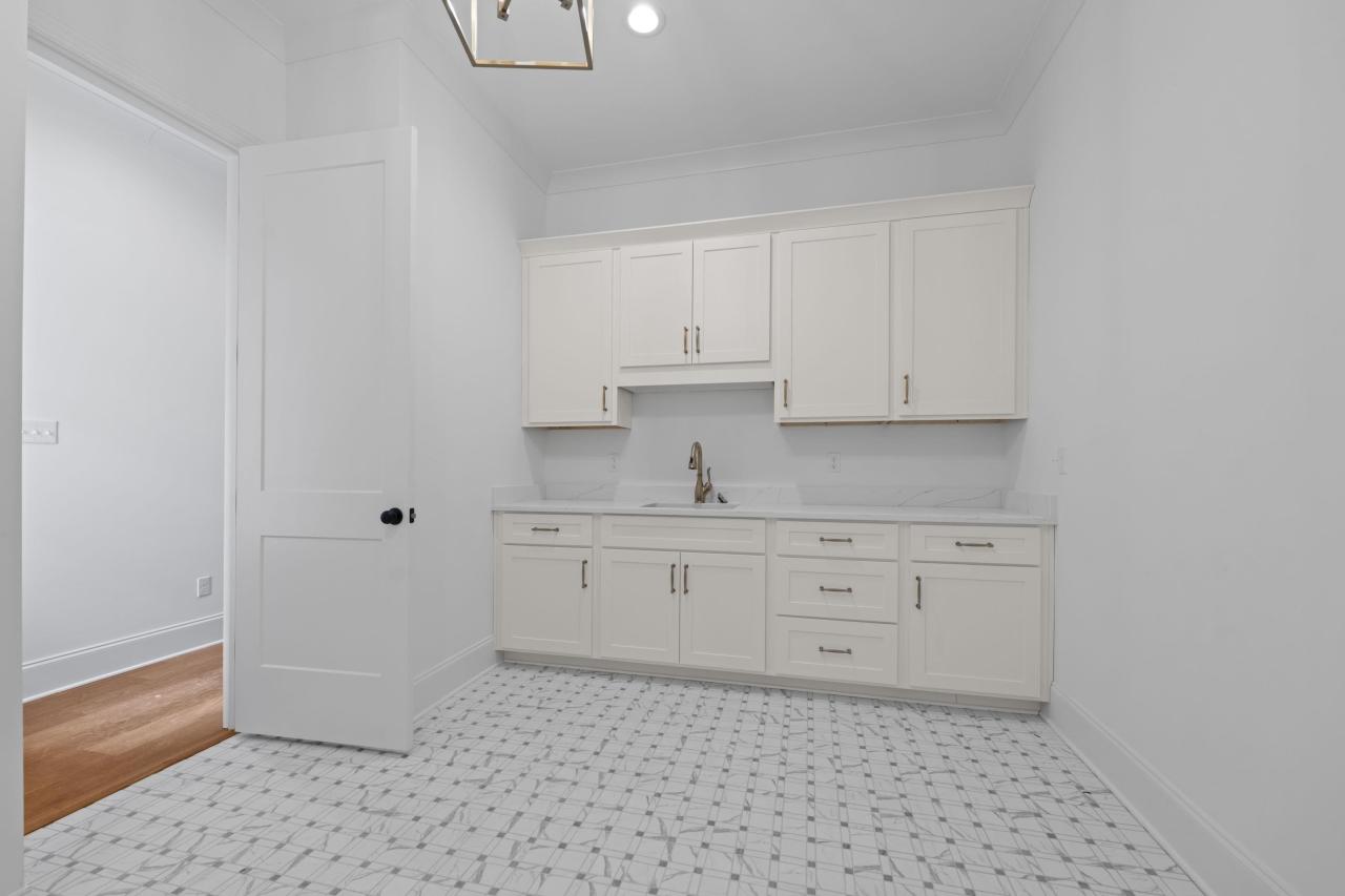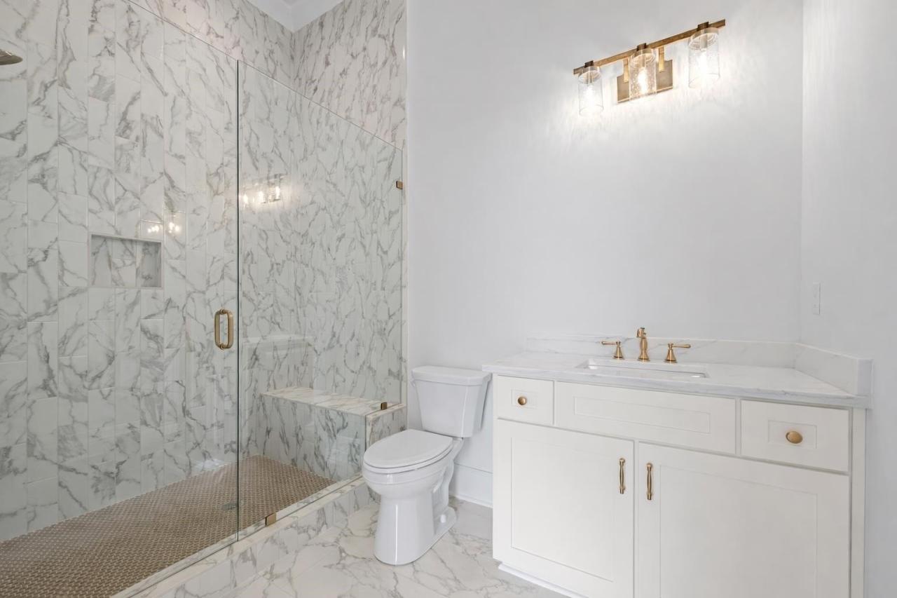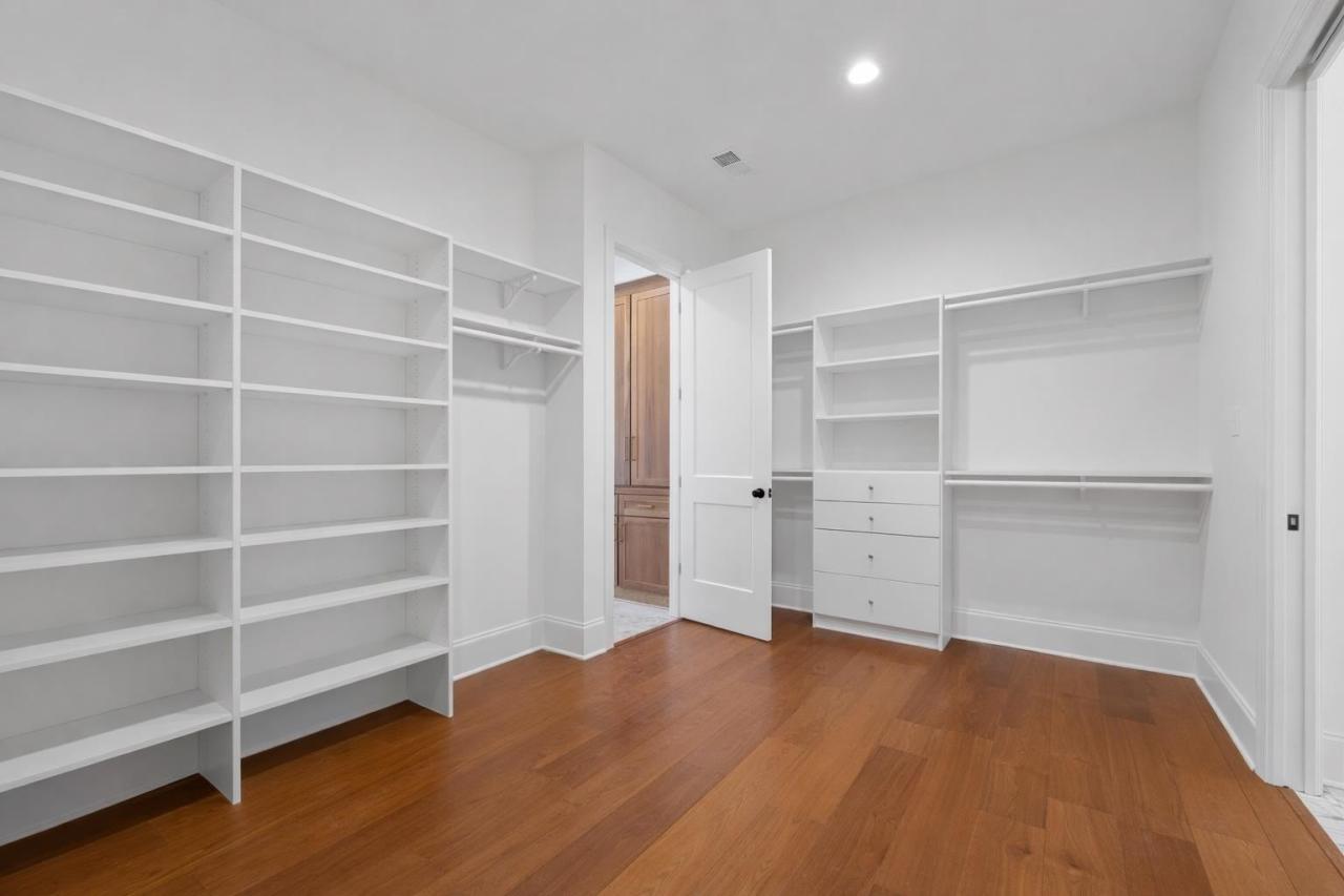 The chef’s kitchen is a statement in both function and elegance, appointed with GE Café Professional Series appliances, stacked smart double convection ovens, a 36-inch commercial gas rangetop, dual dishwashers, built-in refrigerator and freezer, custom cabinetry, and quartz surfaces. Engineered hardwood flooring extends throughout both levels, complemented by soaring 10-foot ceilings, detailed crown molding, and designer finishes.