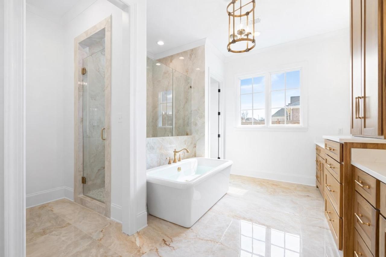 The primary suite serves as a private retreat, highlighted by a spa-inspired bath with a freestanding pedestal soaking tub and champagne bronze fixtures. Gas fireplaces with limestone surrounds, custom millwork, and a wrought iron stair rail add architectural character throughout.