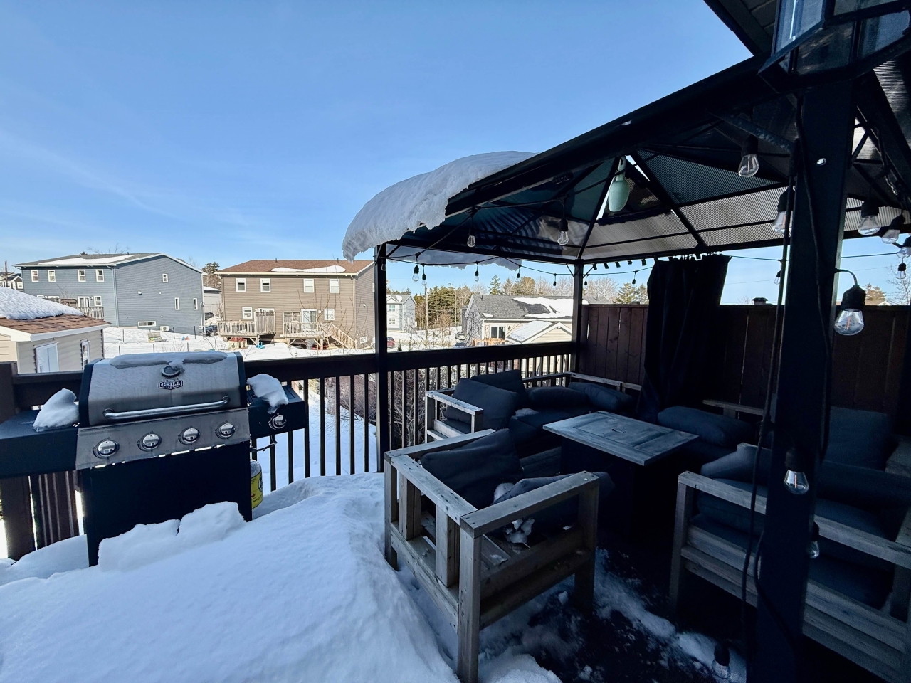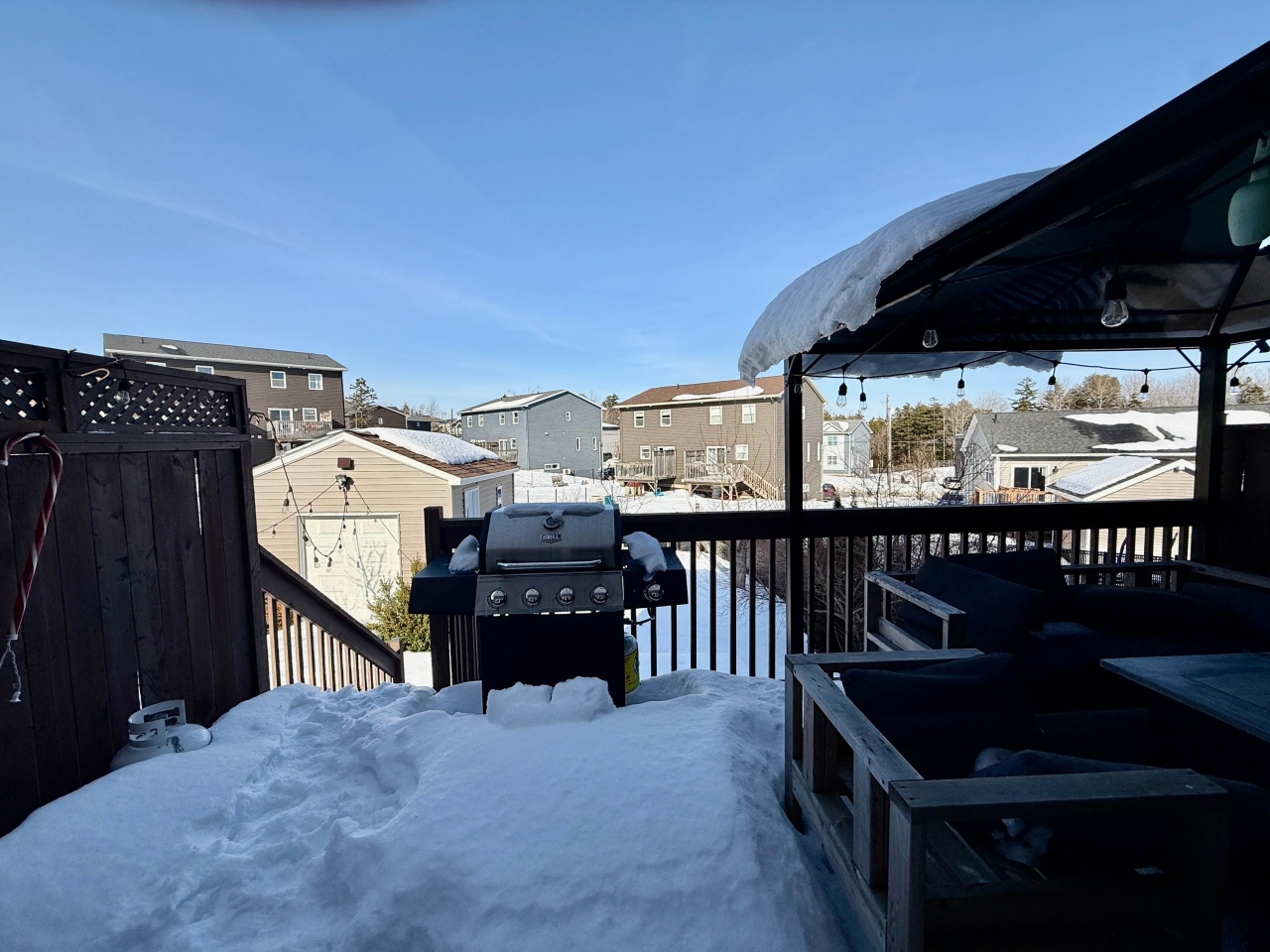 Patio doors lead directly to the private rear deck complete with a shade structure, creating the ideal outdoor retreat for summer barbecues, morning coffee, or relaxing evenings overlooking the fully fenced backyard and garden shed.