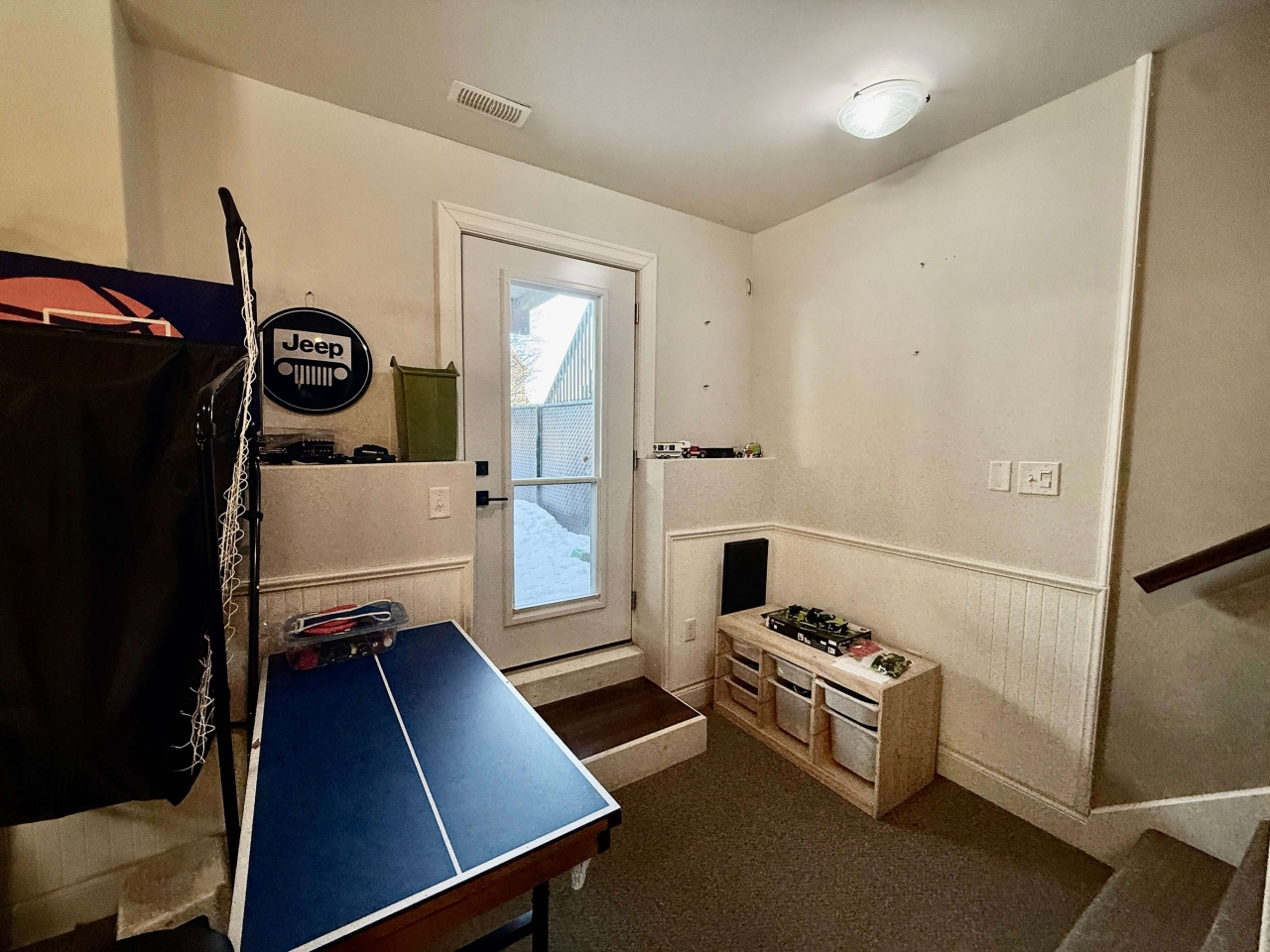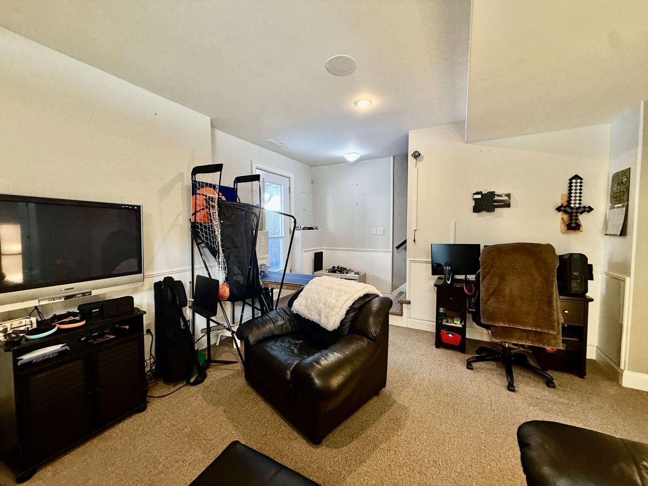 A comfortable rec room ideal for movie nights or a kids’ play area