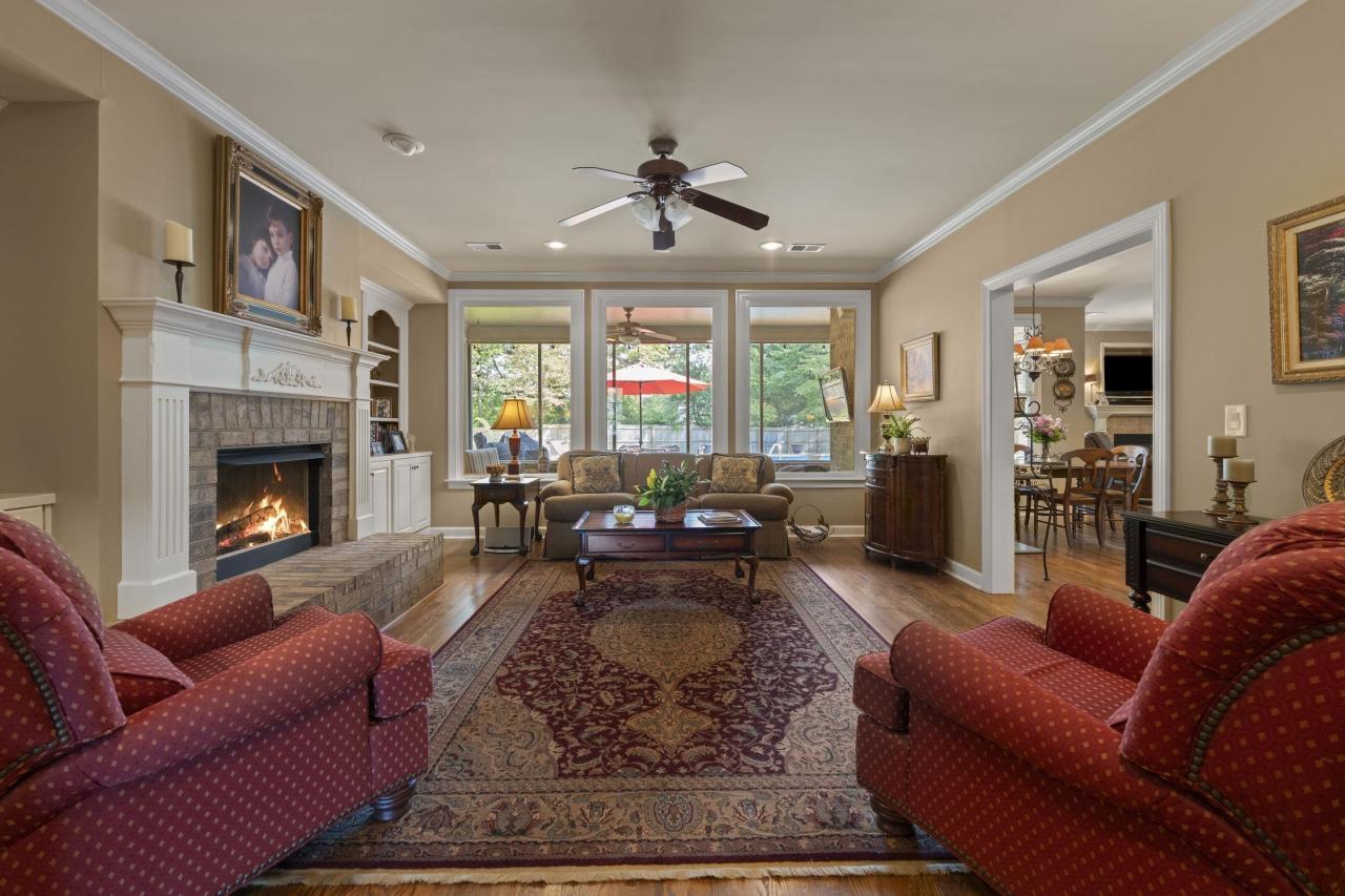 The kitchen is truly the heart of the home, featuring granite countertops, a large island, double ovens, gas cooking, and plenty of space to gather. It flows seamlessly into a cozy hearth room and an oversized great room with built-ins and a fireplace—perfect for hosting or relaxing nights in.