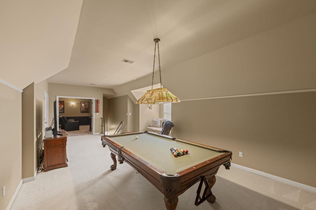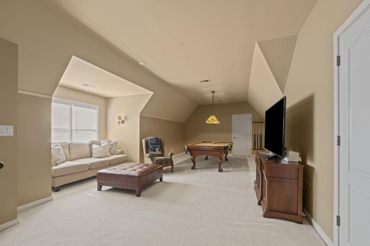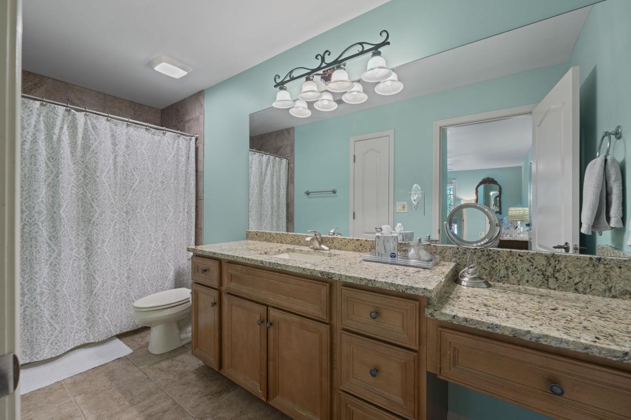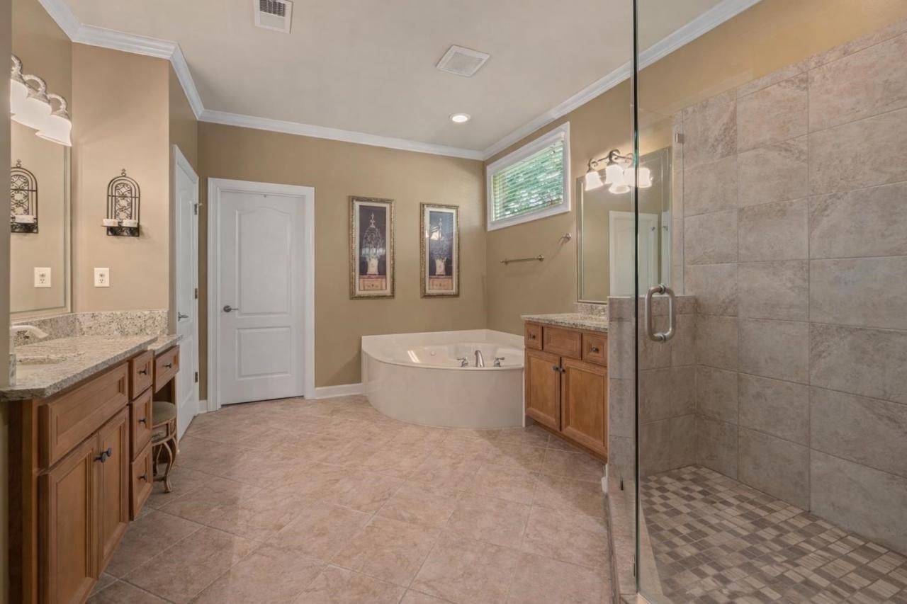 The main-level primary suite feels like a private escape with a spa-like bath, whirlpool tub, and walk-in shower. Upstairs, every bedroom has its own bath, plus a large game room and a true theater room for movie nights at home.