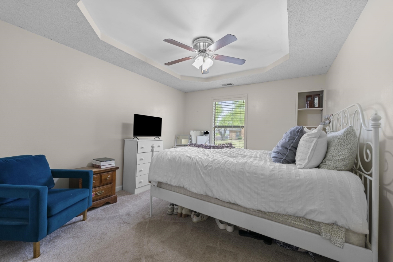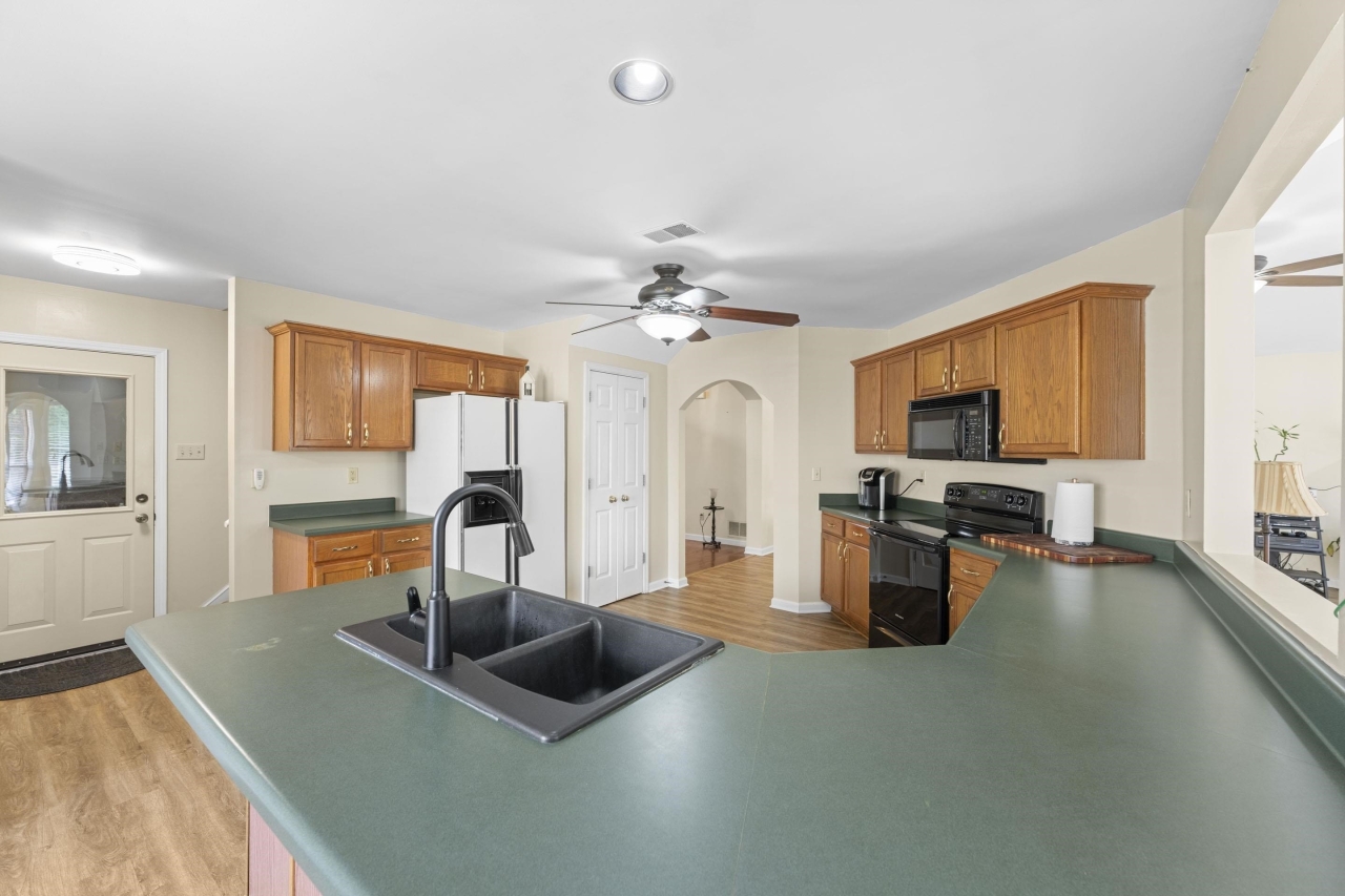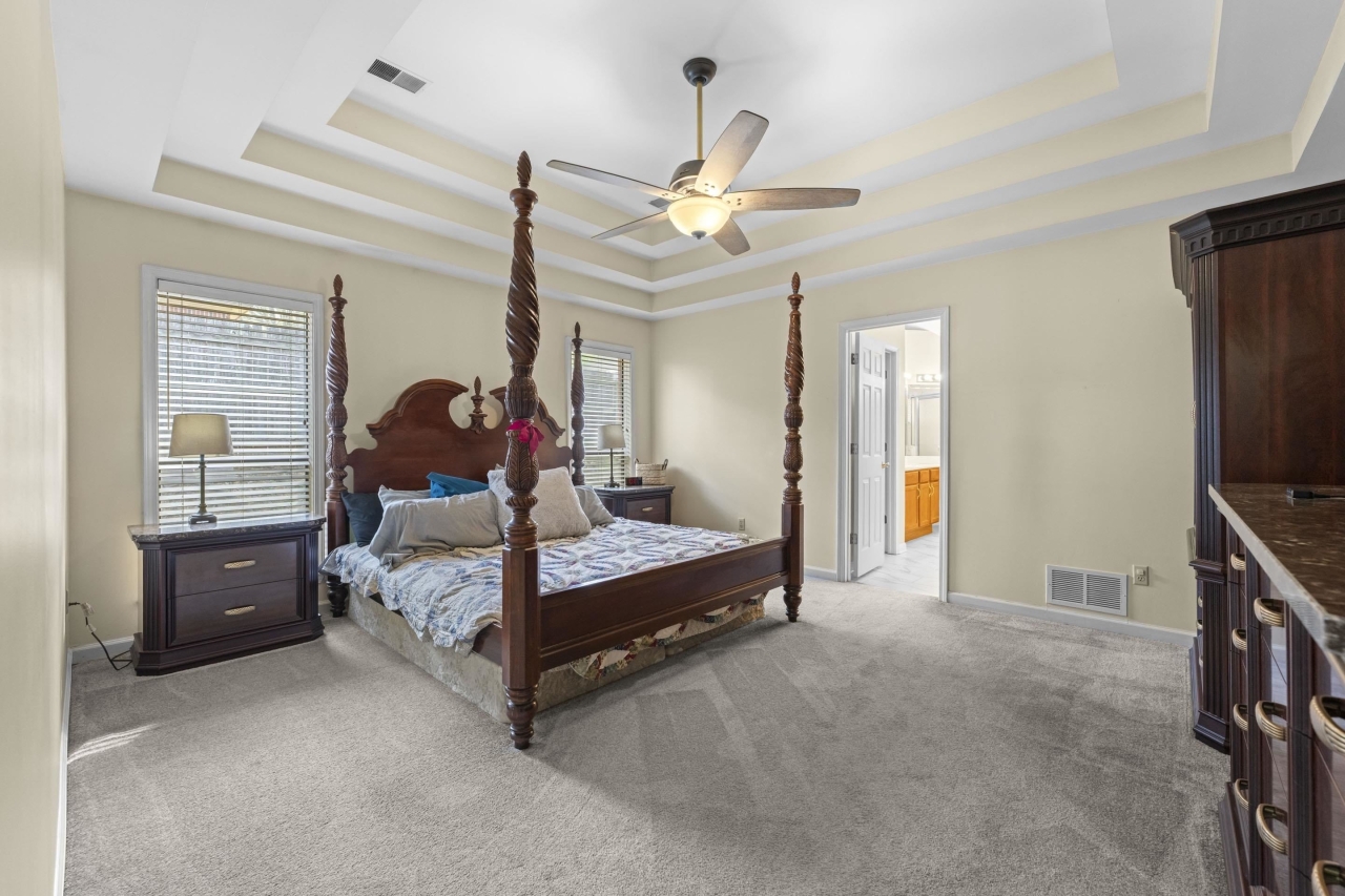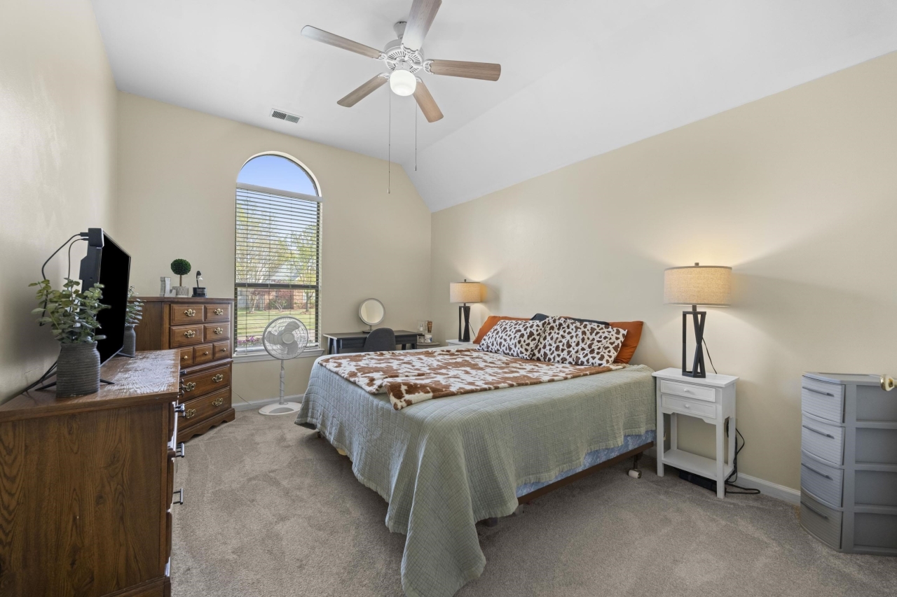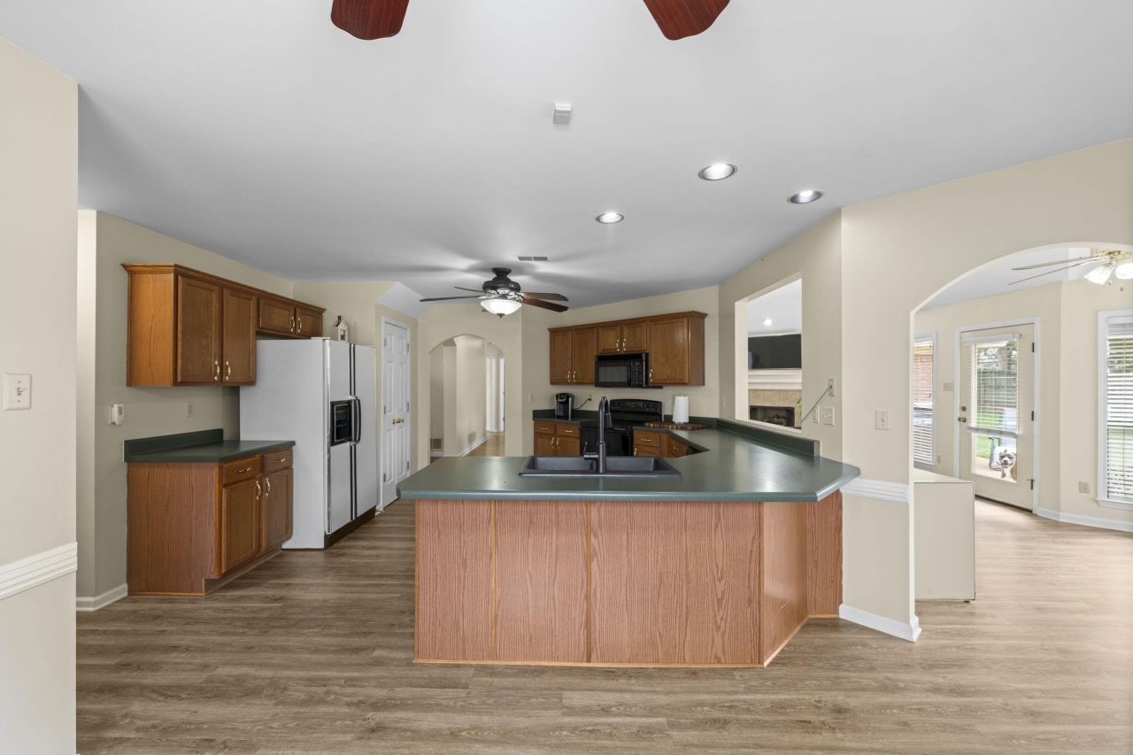 The great room is the heart of the home, with a cozy fireplace and tons of windows that bring in natural light and overlook the fenced backyard. It flows perfectly into a sitting area and a formal dining room, giving you space to relax or host friends and family. The eat-in kitchen offers plenty of cabinet space, a pantry, and room to gather for casual meals.
