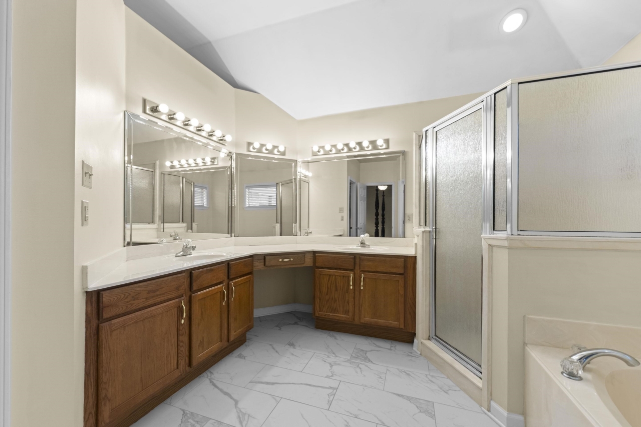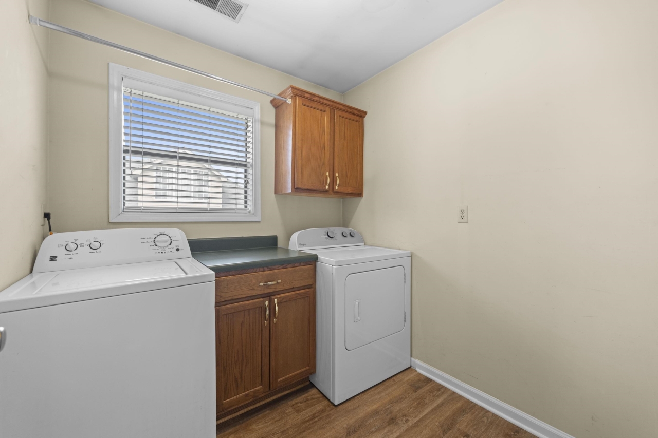 The primary suite is a true retreat with a spacious layout, dual sink vanity with a makeup area, a walk-in shower, and a relaxing whirlpool tub. You’ll also love the dedicated laundry room with cabinets and the huge floored attic for extra storage.