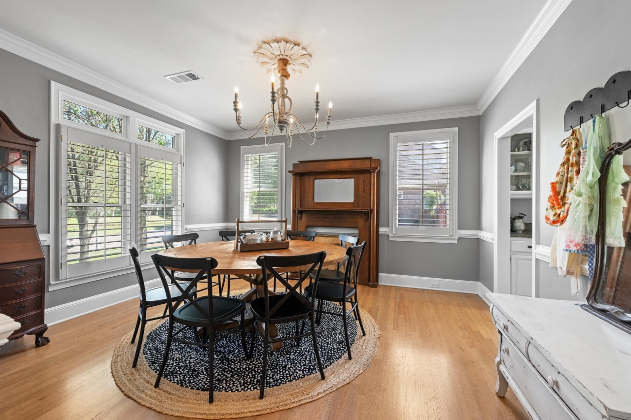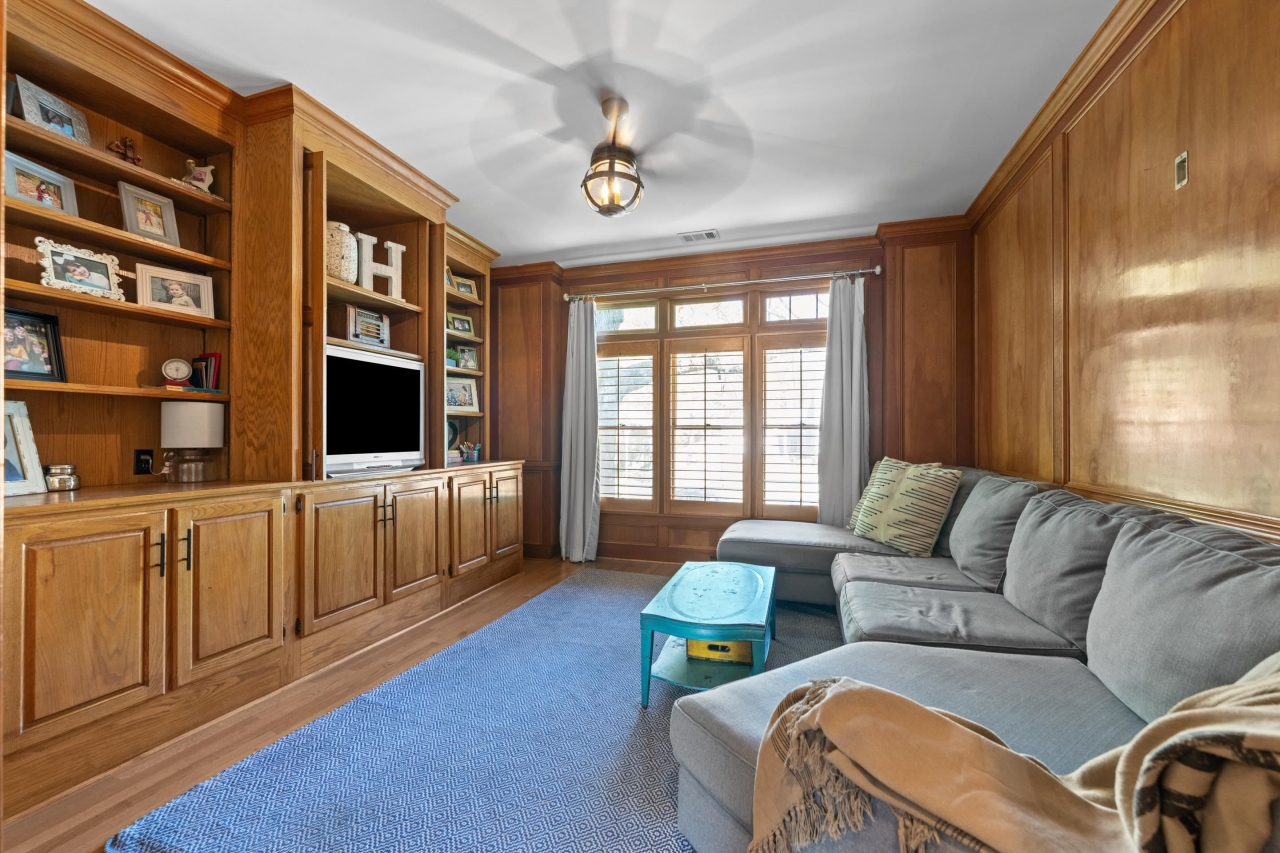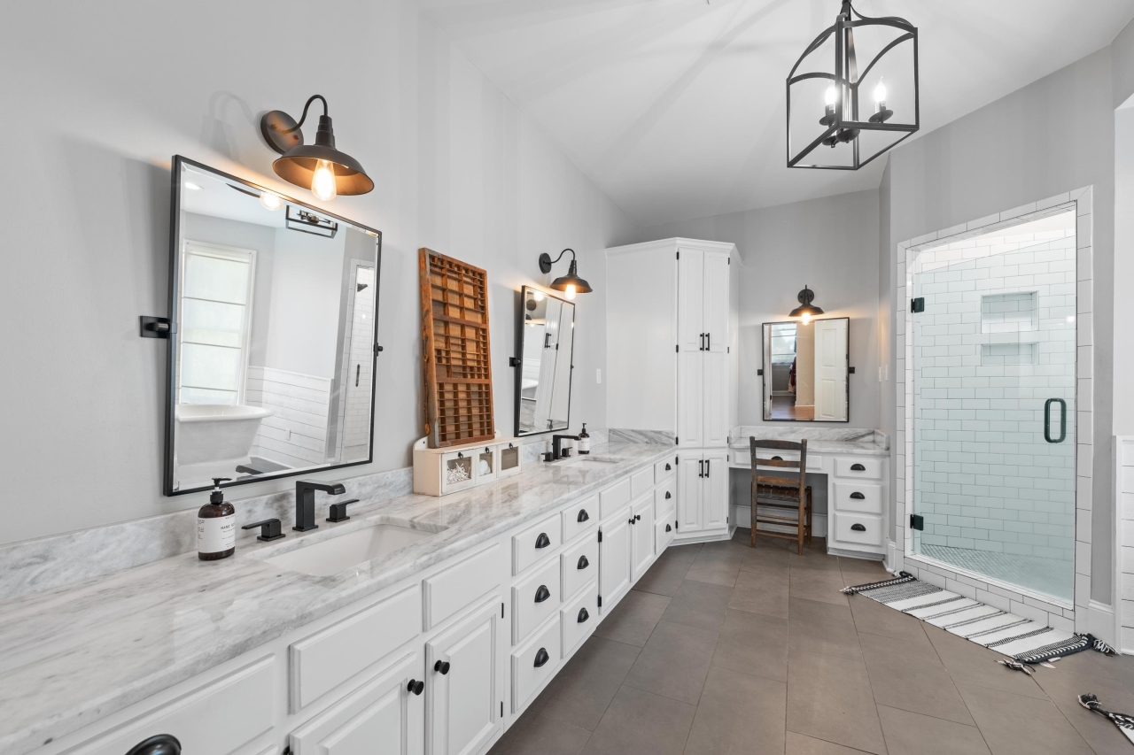 The primary suite offers a true retreat with French doors leading to the backyard, a spacious walk-in closet, and a spa-inspired bath complete with soaking tub, walk-in shower, and dual vanities with a dedicated makeup area. Thoughtfully designed spaces include a formal dining room, private office with library paneling, and a functional friend’s entry.