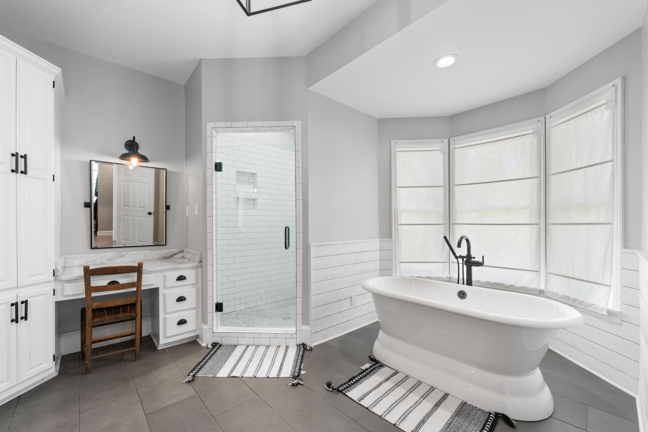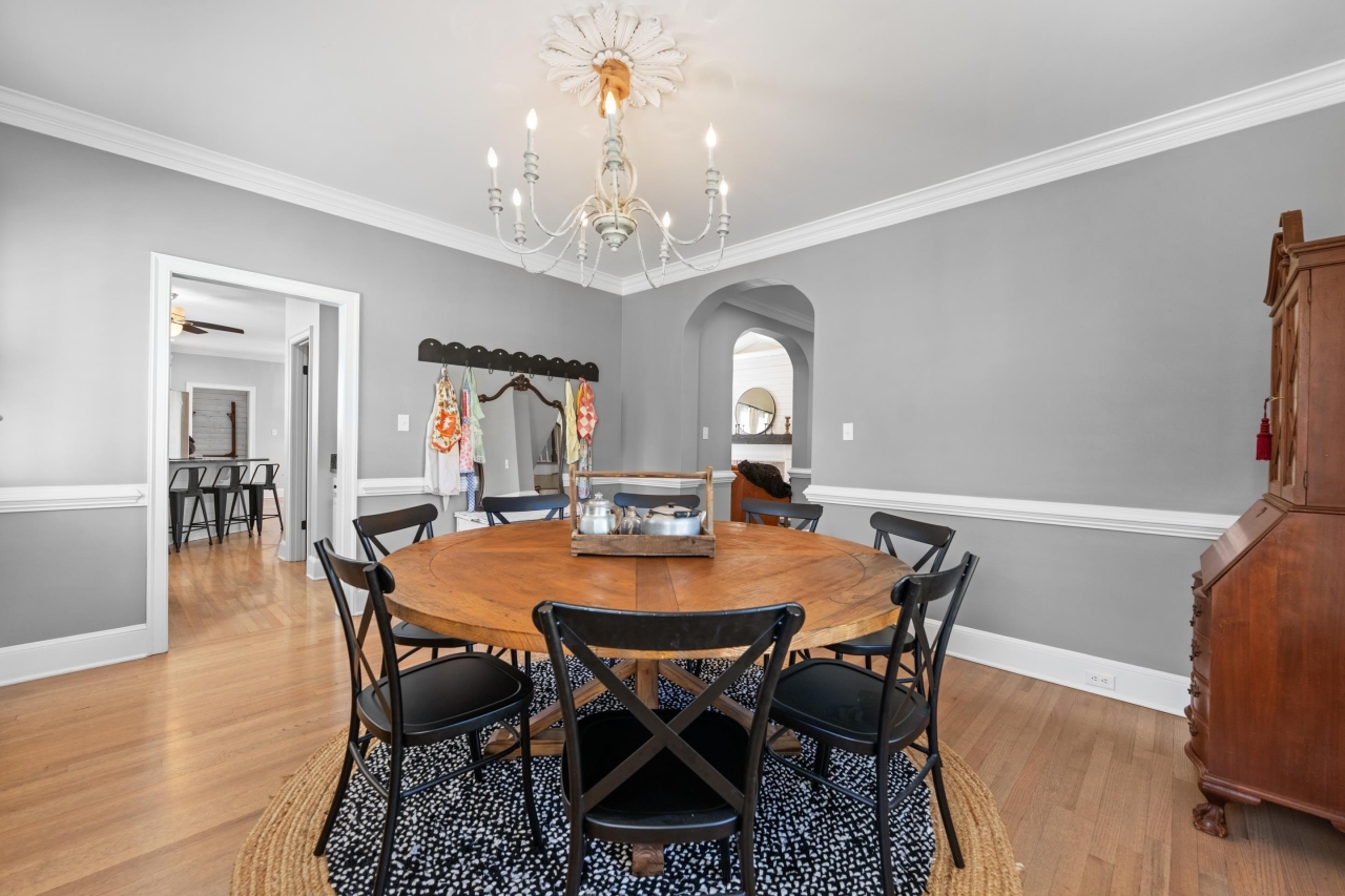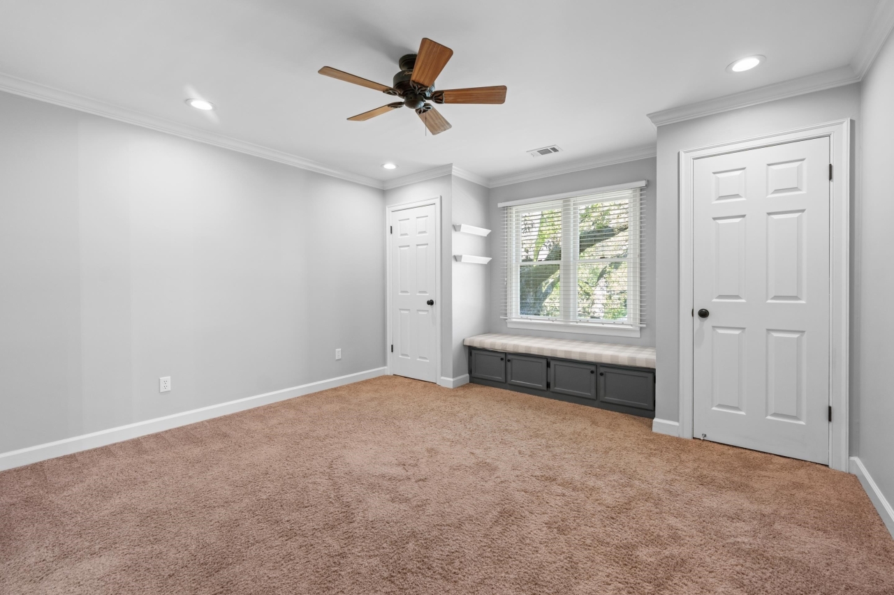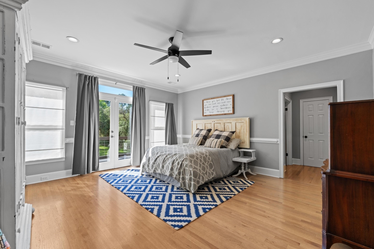 The primary suite offers a true retreat with French doors leading to the backyard, a spacious walk-in closet, and a spa-inspired bath complete with soaking tub, walk-in shower, and dual vanities with a dedicated makeup area. Thoughtfully designed spaces include a formal dining room, private office with library paneling, and a functional friend’s entry.