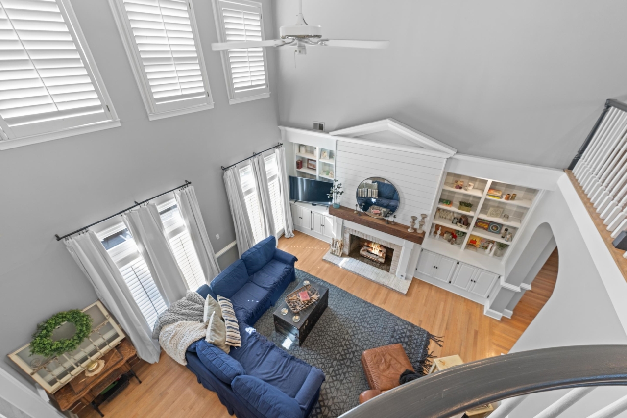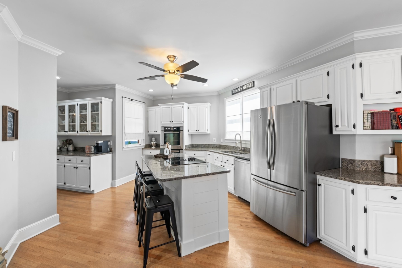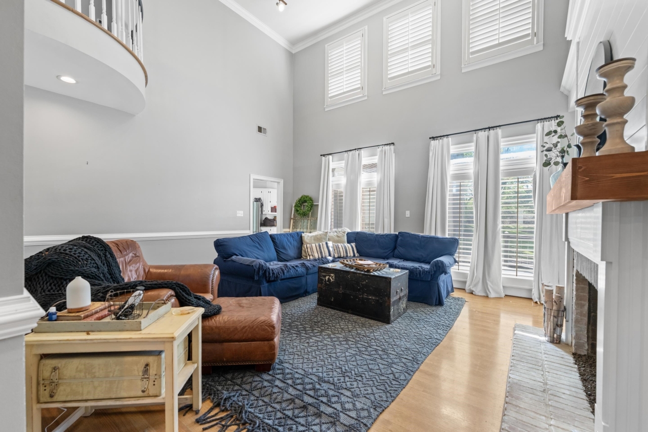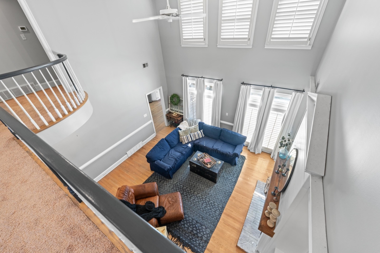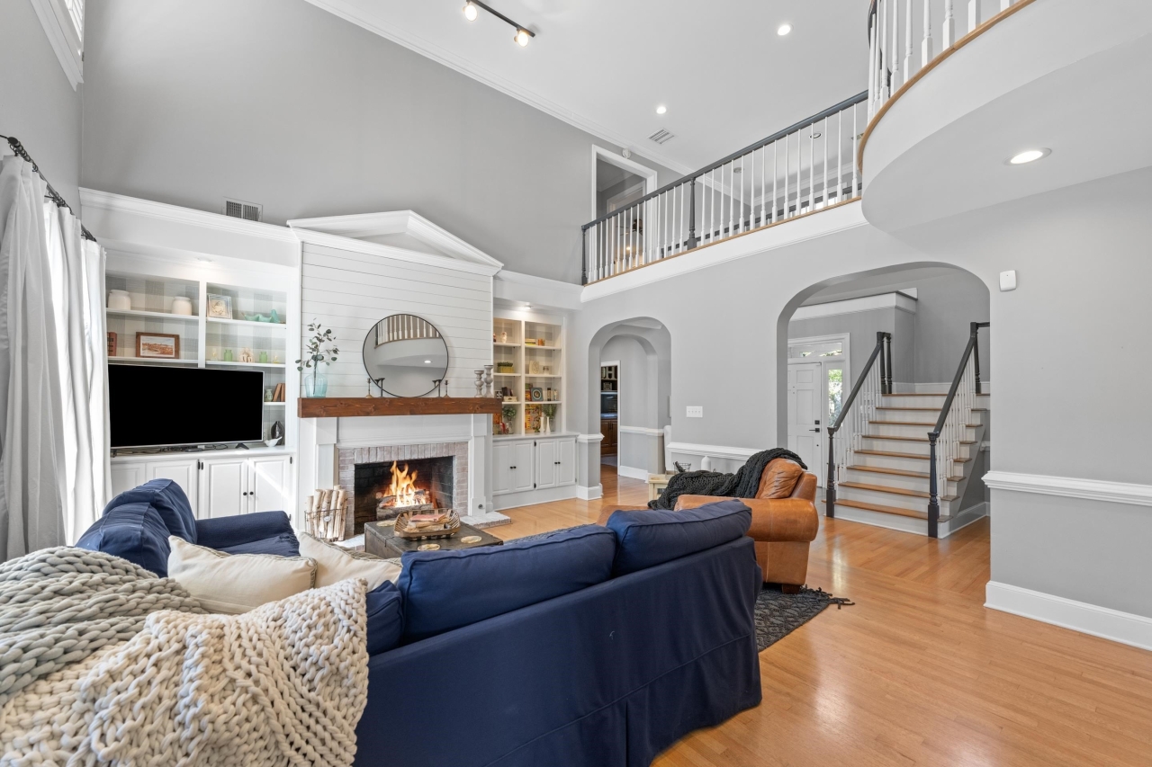 Inside, elegant details shine with nail-down hardwood flooring, custom millwork, plantation shutters, and a dramatic two-story great room anchored by a gas fireplace and expansive windows. The gourmet kitchen is designed for both entertaining and everyday living, featuring Bosch stainless steel appliances, double ovens, granite countertops, a butler’s pantry, and an impressive 8x6 walk-in pantry.