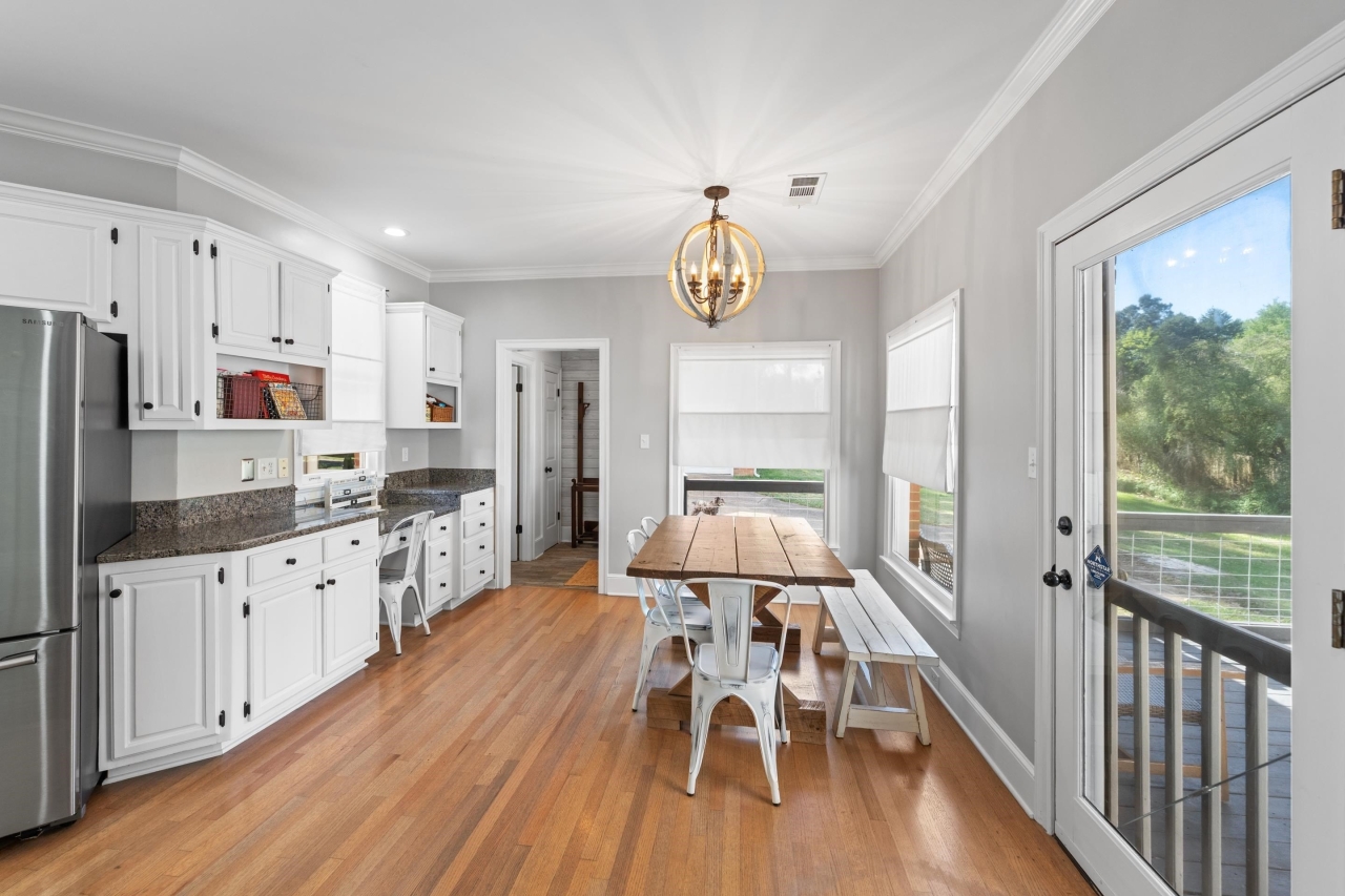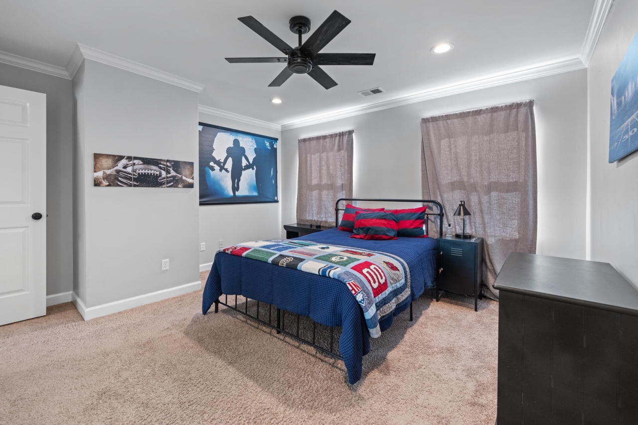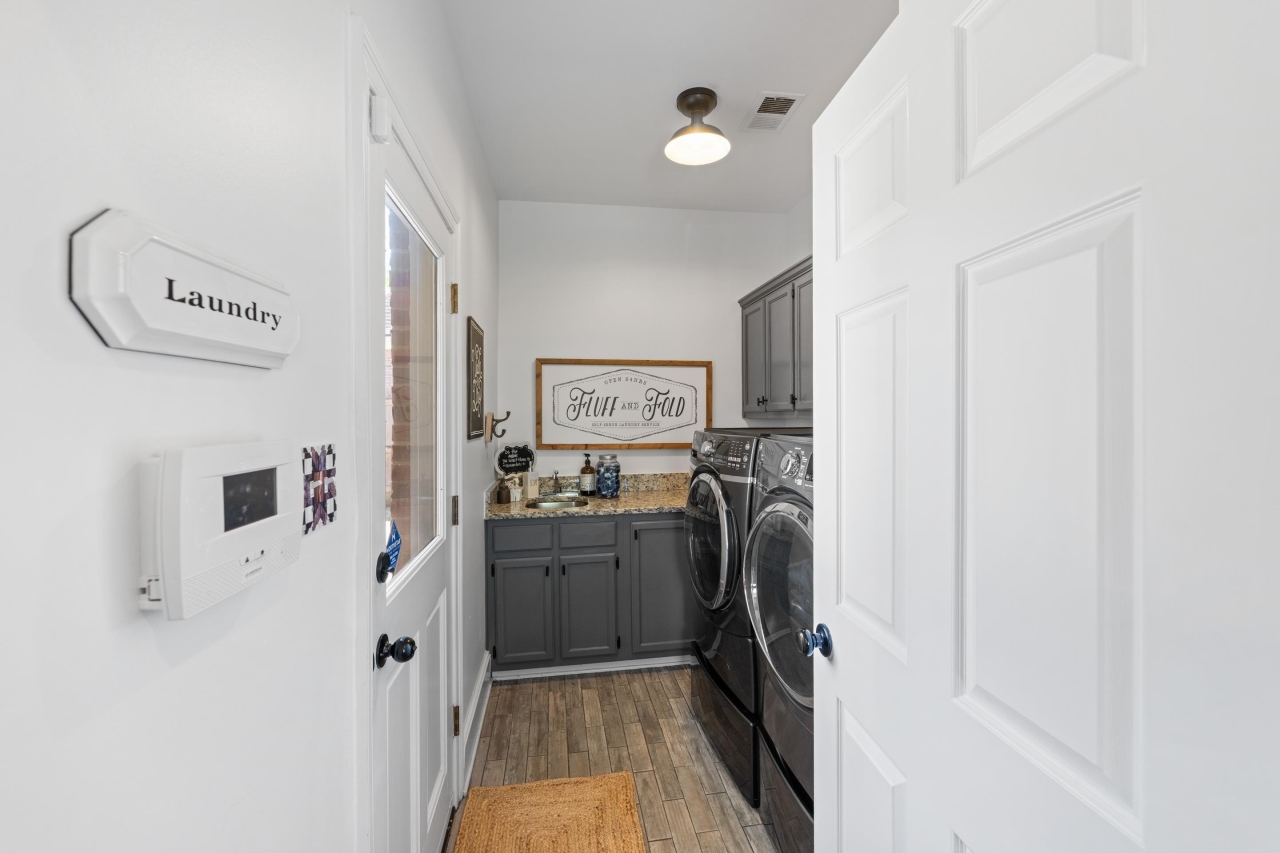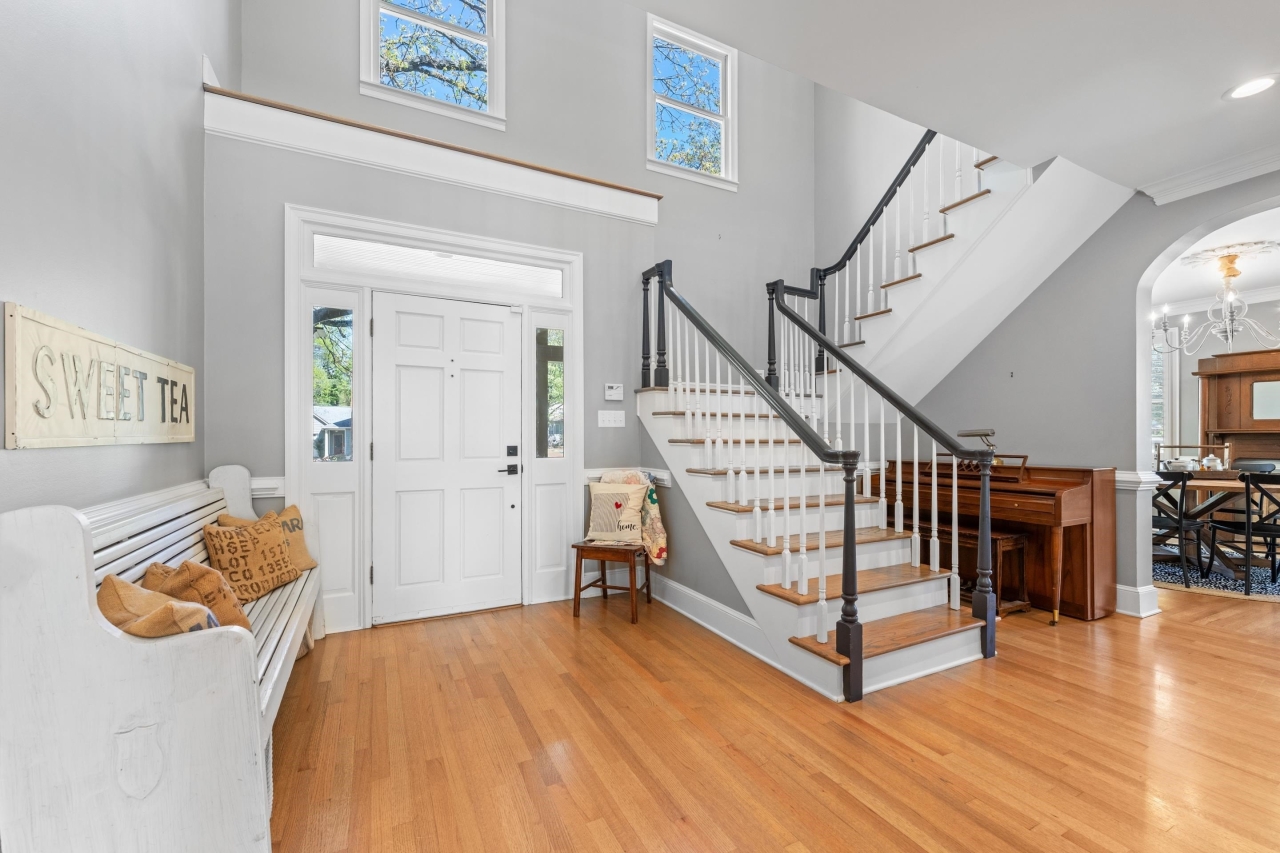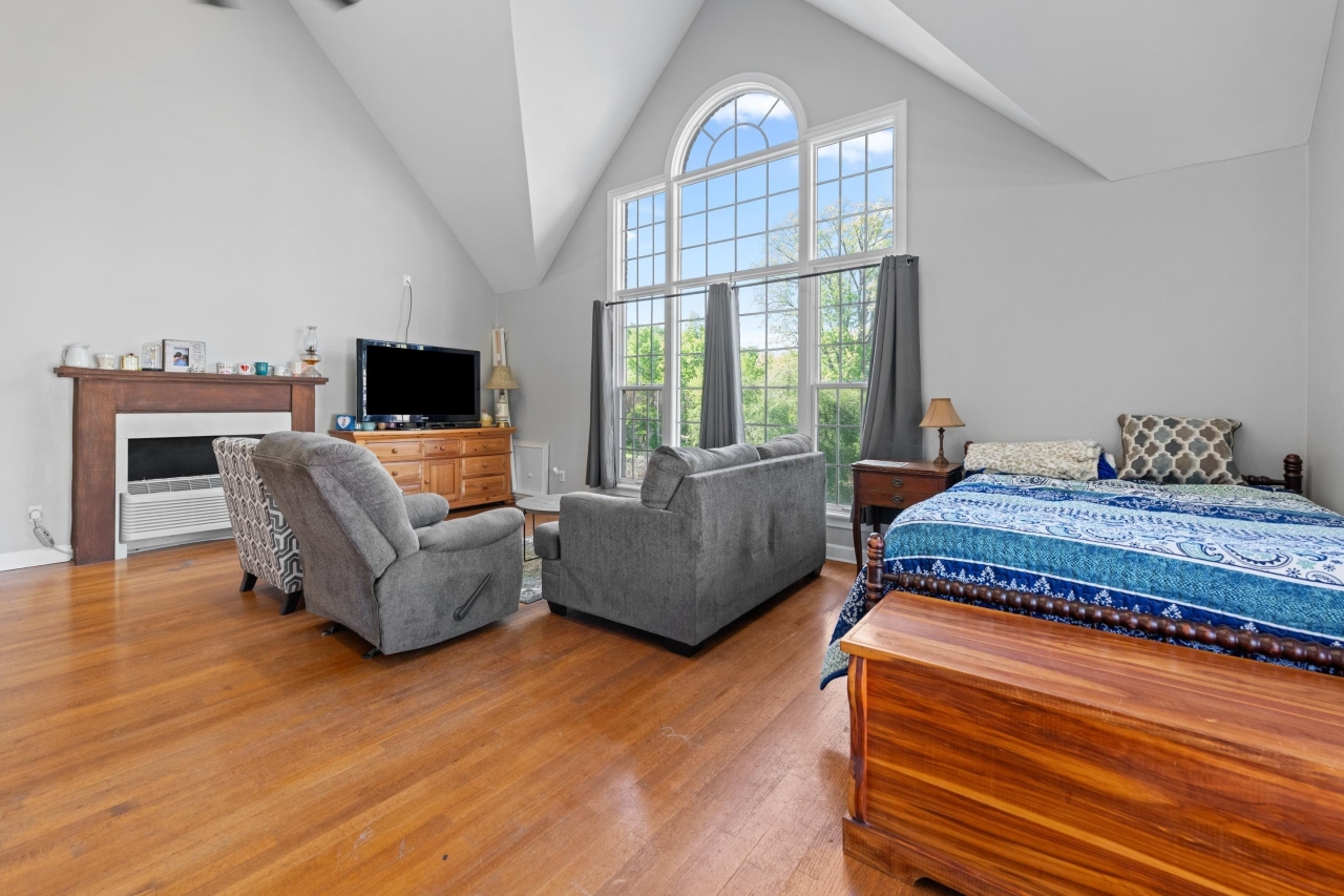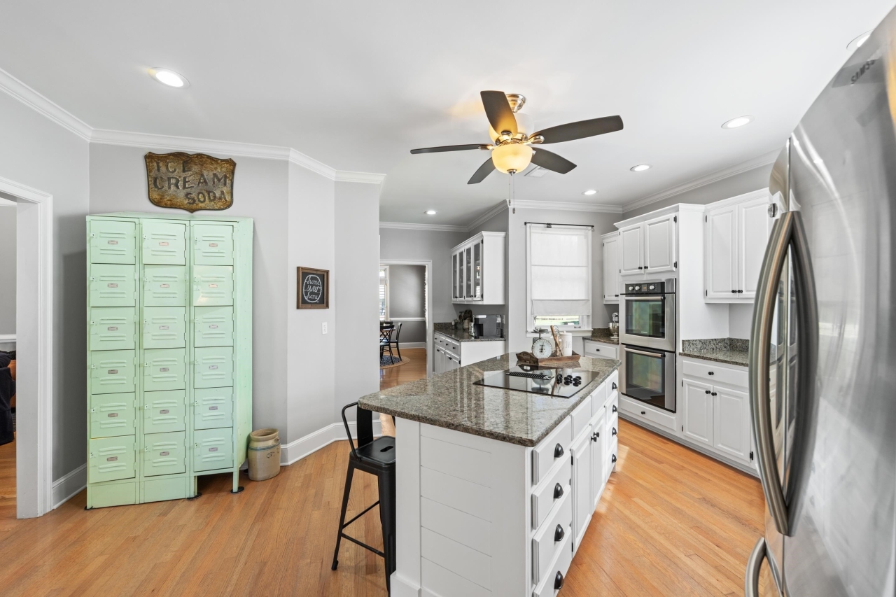 Inside, elegant details shine with nail-down hardwood flooring, custom millwork, plantation shutters, and a dramatic two-story great room anchored by a gas fireplace and expansive windows. The gourmet kitchen is designed for both entertaining and everyday living, featuring Bosch stainless steel appliances, double ovens, granite countertops, a butler’s pantry, and an impressive 8x6 walk-in pantry.