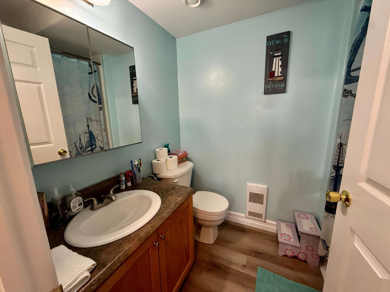 The bright, open-concept main level is designed for everyday living and entertaining, featuring a sun-filled living room and a spacious eat-in kitchen with direct access to the rear deck—perfect for summer BBQs or morning coffee while enjoying the salty sea air. A convenient powder room completes this level.