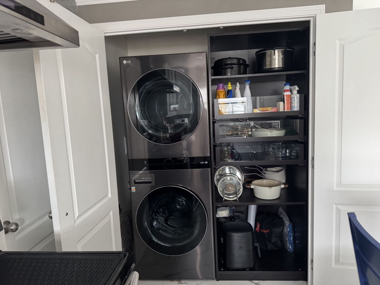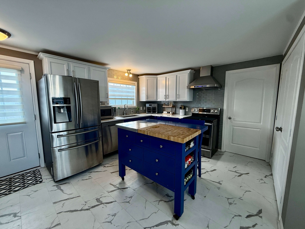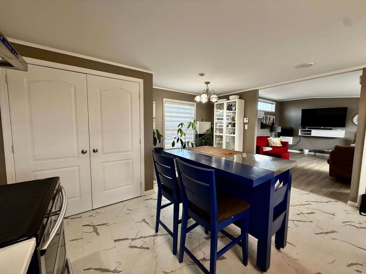 The heart of the home is the stunning kitchen—thoughtfully designed with a large center island, stainless steel appliances, and ample cabinetry. It flows seamlessly into the living area, making it ideal for entertaining or simply enjoying everyday living. Expansive windows fill the space with natural light, complemented by convenient power blinds for privacy and comfort.