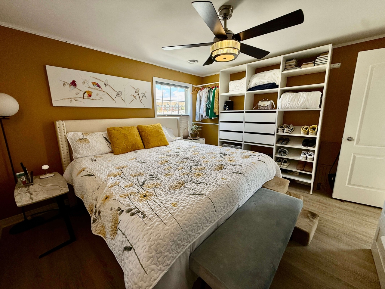 The living room offers a warm and welcoming space with modern flooring and clean, neutral tones, while the well-appointed bedroom provides comfort and functionality, complete with stylish finishes and organized storage solutions.